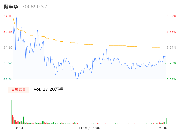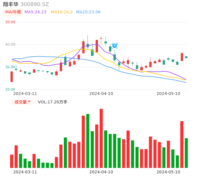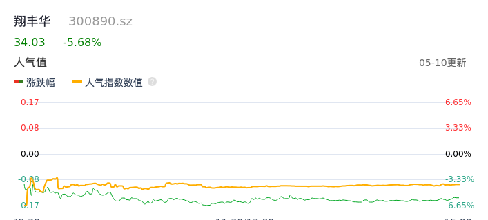 05月10日,翔丰华收报34.03,股价涨幅-5.68%,成交金额5.88亿元,换手率17.67%。