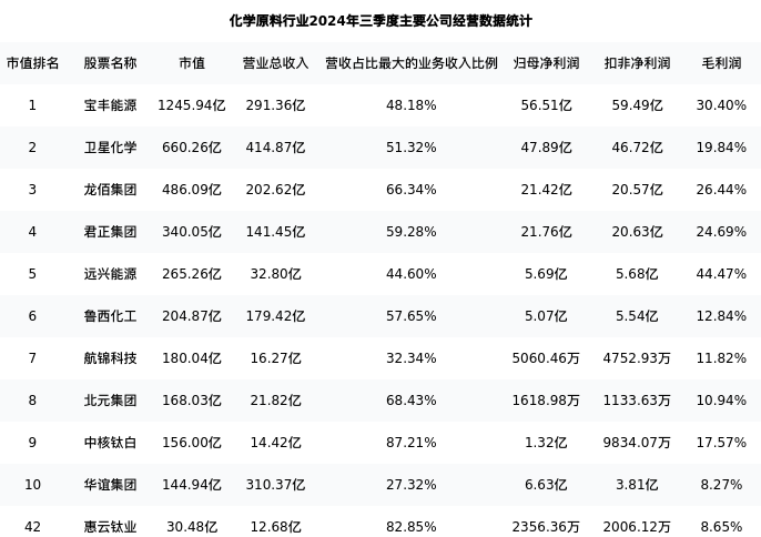 惠云钛业最新报告期数据为三季度,下表汇总了化学原料行业内市值靠前的公司三季度主要经营数据