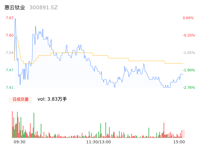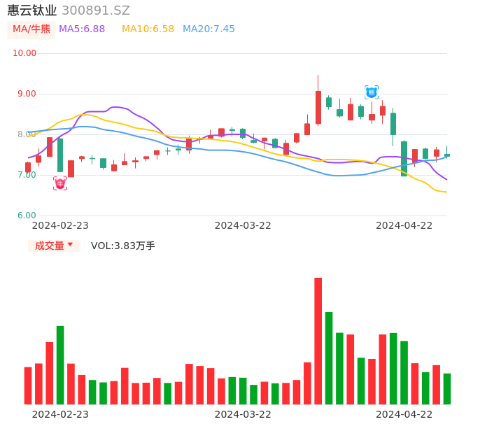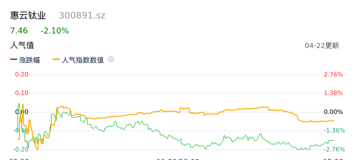 04月22日,惠云钛业收报7.46,股价涨幅-2.10%,成交金额2872.05万元,换手率1.15%。