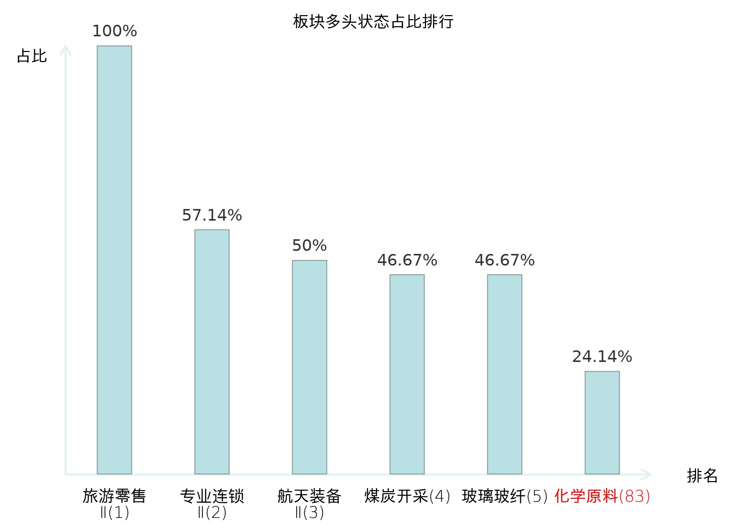 全市场所有行业板块中主力多头状态占比排名中,旅游零售Ⅱ板块位居第一。普钢板块名次提升最快,较昨日上升64位。