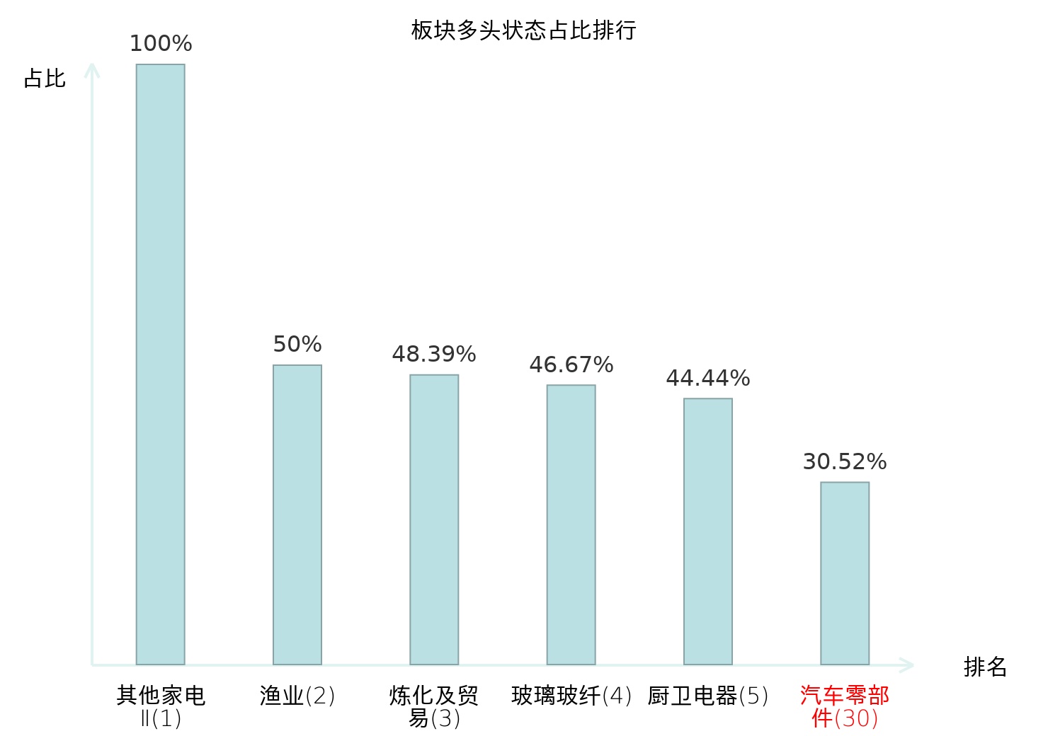 全市场所有行业板块中主力多头状态占比排名中,其他家电Ⅱ板块位居第一。冶钢原料板块名次提升最快,较昨日上升67位。