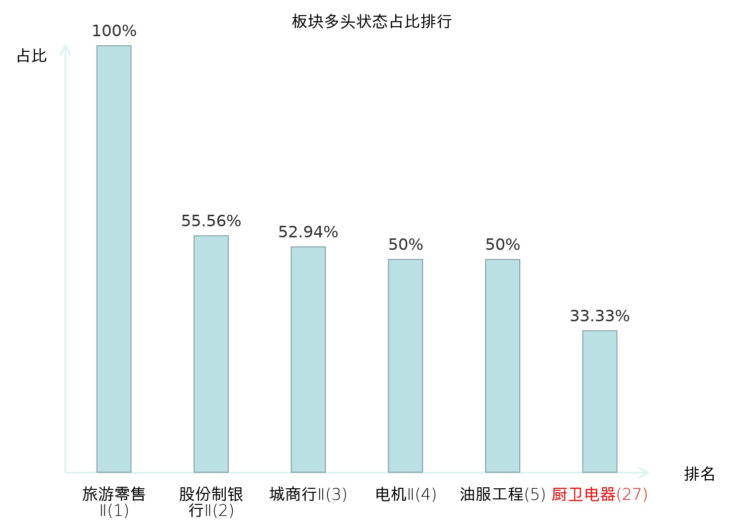 全市场所有行业板块中主力多头状态占比排名中,旅游零售Ⅱ板块位居第一。互联网电商板块名次提升最快,较昨日上升65位。