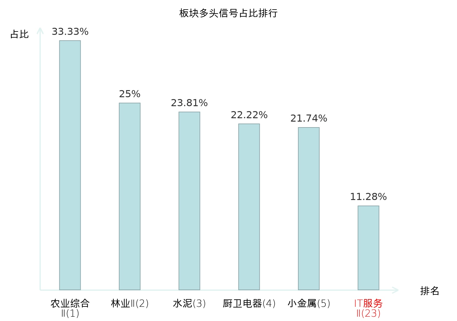 全市场所有行业板块中主力多头信号占比排名中,农业综合Ⅱ板块位居第一。农业综合Ⅱ板块名次提升最快,较昨日上升127位。