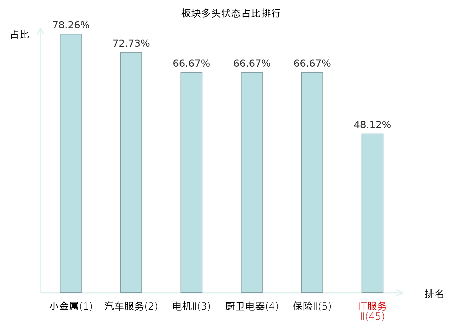 全市场所有行业板块中主力多头状态占比排名中,小金属板块位居第一。农业综合Ⅱ板块名次提升最快,较昨日上升88位。