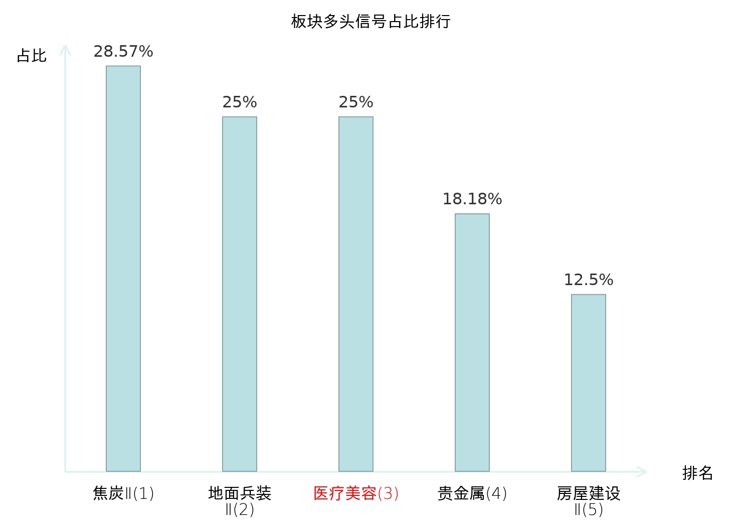 全市场所有行业板块中主力多头信号占比排名中,焦炭Ⅱ板块位居第一。医疗美容板块名次提升最快,较昨日上升124位。