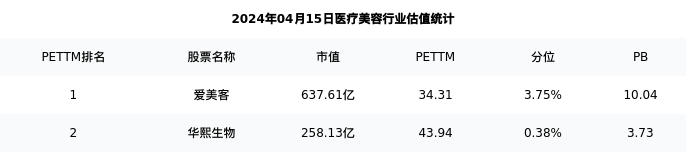 从估值角度看:爱美客最新市盈率PETTM为34.31,在行业内排名1/3,处于3.75分位。