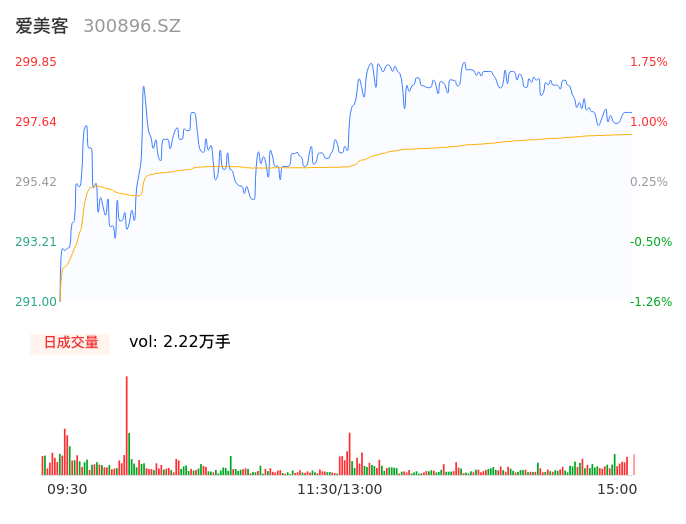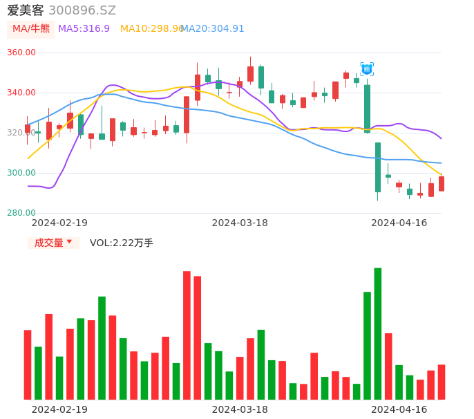 04月16日,爱美客收报298.09,股价涨幅1.15%,成交金额6.59亿元,换手率1.48%。