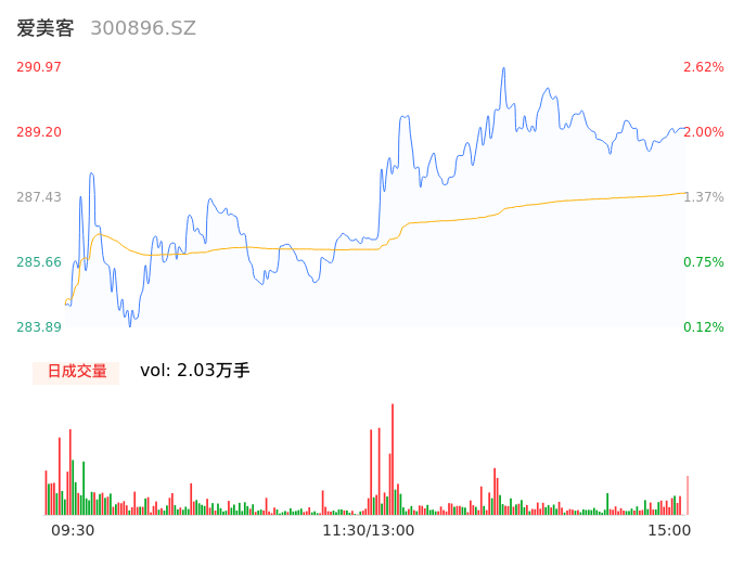 04月23日,爱美客收报289.31,股价涨幅2.03%,成交金额5.84亿元,换手率1.36%。