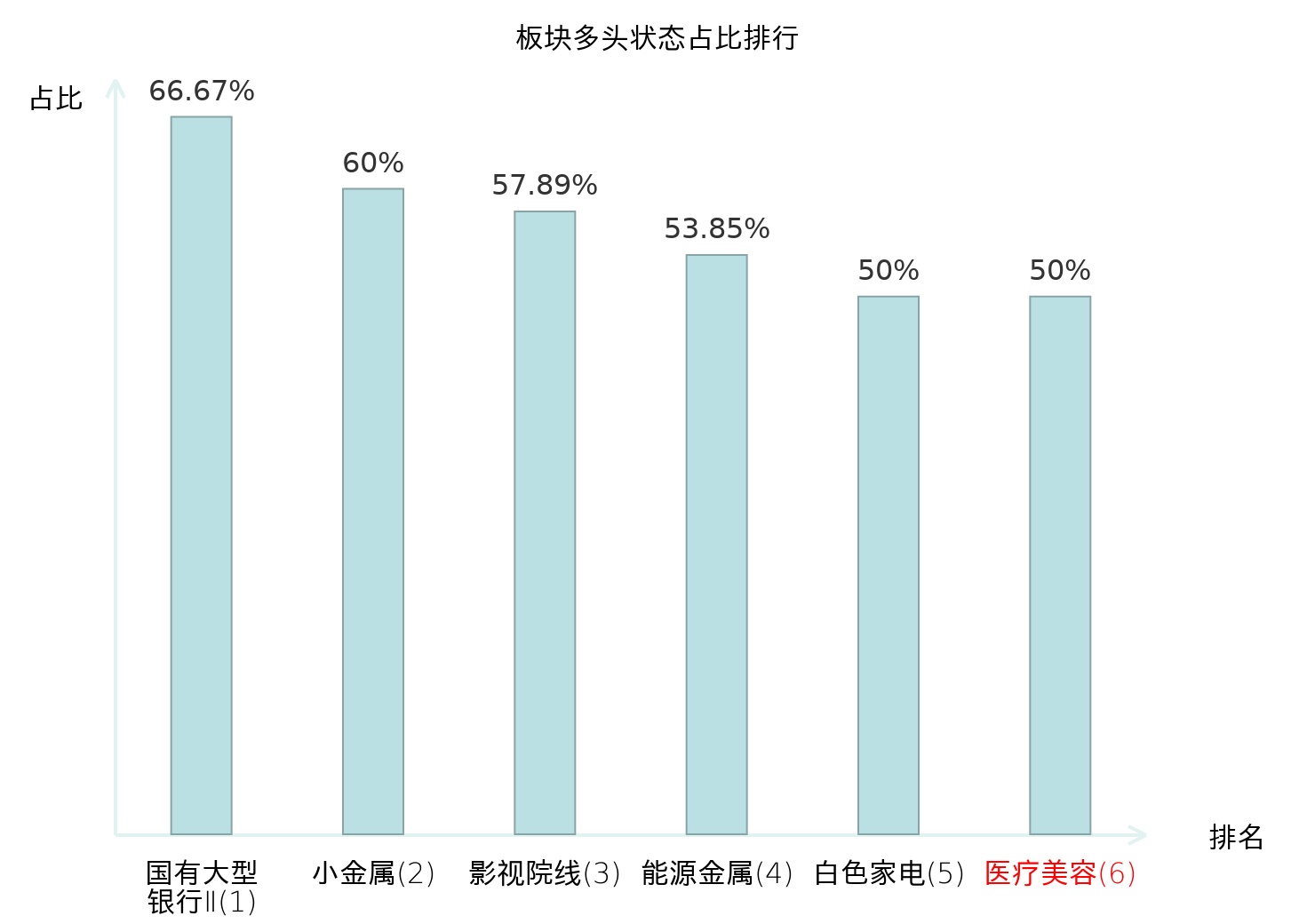 全市场所有行业板块中主力多头状态占比排名中,国有大型银行Ⅱ板块位居第一。装修装饰Ⅱ板块名次提升最快,较昨日上升48位。