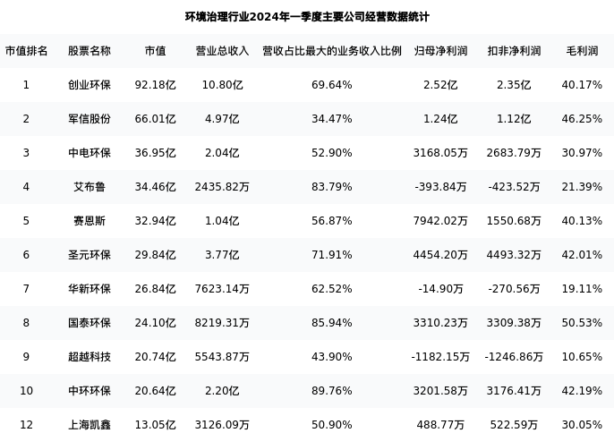 上海凯鑫最新报告期数据为一季度,下表汇总了环境治理行业内市值靠前的公司一季度主要经营数据
