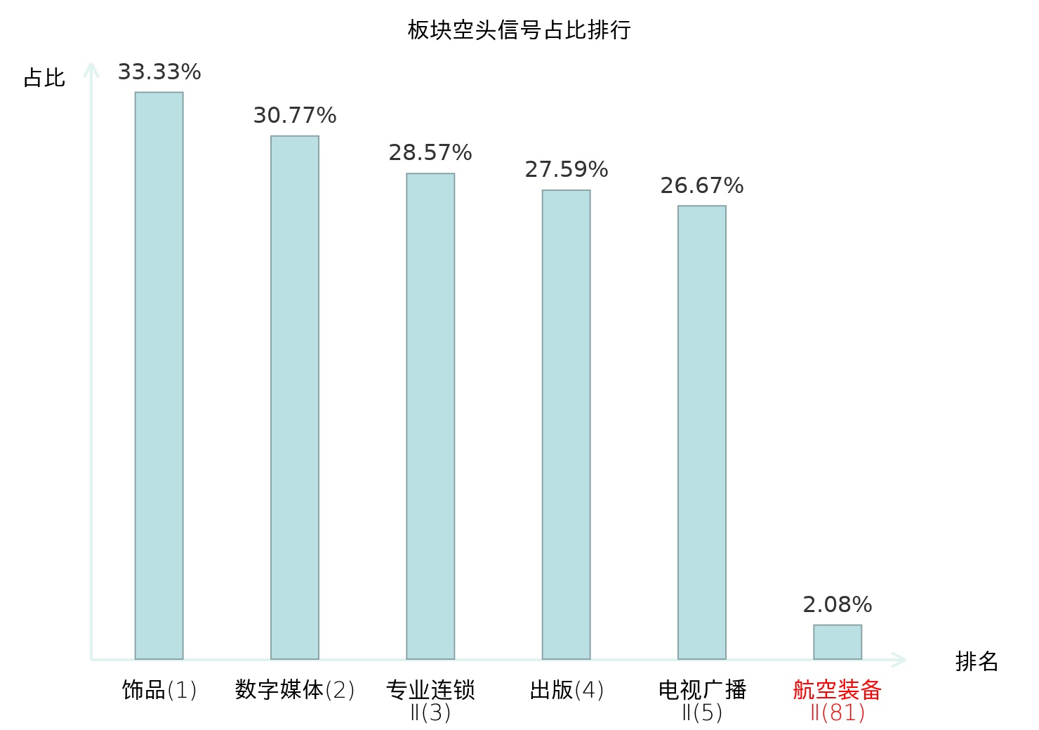 全市场所有行业板块中主力空头信号占比排名中,饰品板块位居第一。城商行Ⅱ板块名次提升最快,较昨日上升121位。