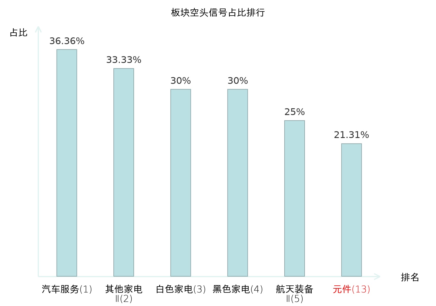 全市场所有行业板块中主力空头信号占比排名中,汽车服务板块位居第一。汽车服务板块名次提升最快,较昨日上升115位。