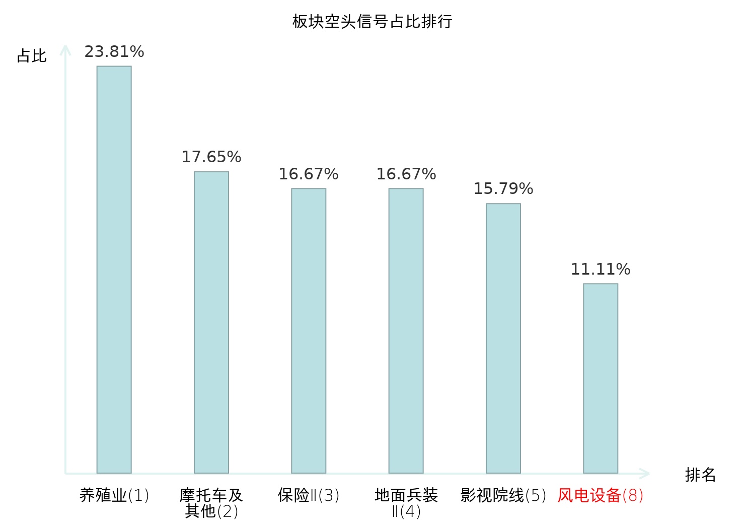 全市场所有行业板块中主力空头信号占比排名中,养殖业板块位居第一。养殖业板块名次提升最快,较昨日上升114位。