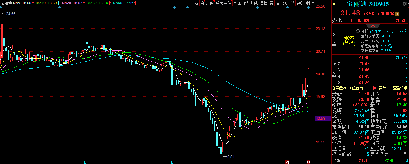 盘面上,截至今日收盘,宝丽迪涨停,报21.48元,成交额4.62亿元。