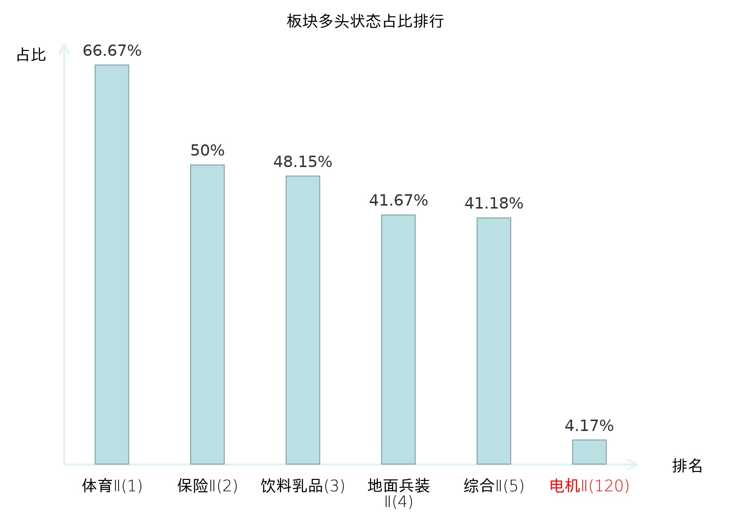 全市场所有行业板块中主力多头状态占比排名中,体育Ⅱ板块位居第一。种植业板块名次提升最快,较昨日上升70位。