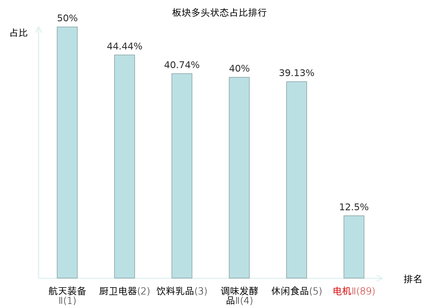 全市场所有行业板块中主力多头状态占比排名中,航天装备Ⅱ板块位居第一。林业Ⅱ板块名次提升最快,较昨日上升92位。