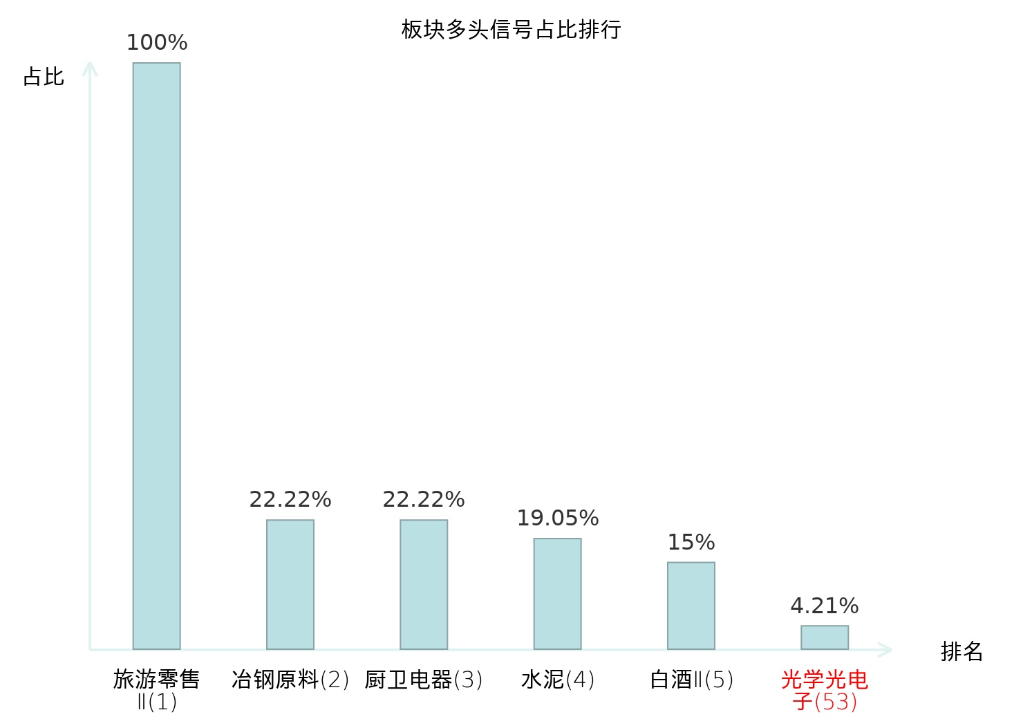 全市场所有行业板块中主力多头信号占比排名中,旅游零售Ⅱ板块位居第一。旅游零售Ⅱ板块名次提升最快,较昨日上升130位。