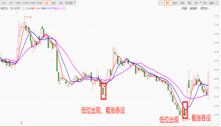 股价从17.50高位下跌以来,股价在低位出现看涨吞没组合。阶段性的低点上涨反弹机会都是以低位出现看涨吞没K线组合。1、在看涨吞没形态中,第一天的实体非常小,而第二天的实体非常大,这种情况可能说明原有趋势的驱动力正在消退,而新趋势的潜在力量正在壮大。2、看涨吞没形态出现在超长期的或非常急剧的市场运动之后。如果存在超长期的下降趋势,则增加了以下这种可能性:最后的空头已接近抛出,股价无力下行,只要有多头入市买进,这种情况下,市场可能缺少足够的新的空头抛压,无力继续打压股价下行,就容易遭受到抄底多头将股价迅速拉抬推高。