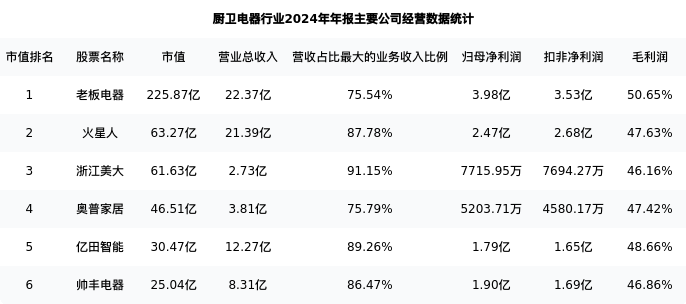 亿田智能最新报告期数据为年报,下表汇总了厨卫电器行业内市值靠前的公司年报主要经营数据