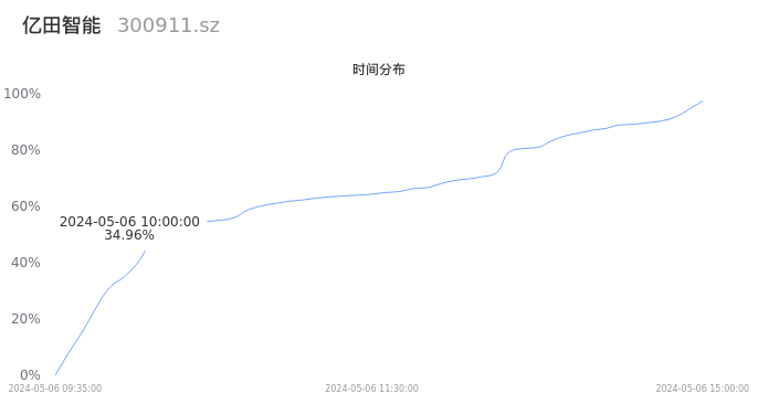 300911亿田智能2024年05月06日成交5.21万手,成交金额1.53亿元,相较昨日放量9209手,换手率5.23%,成交清淡。