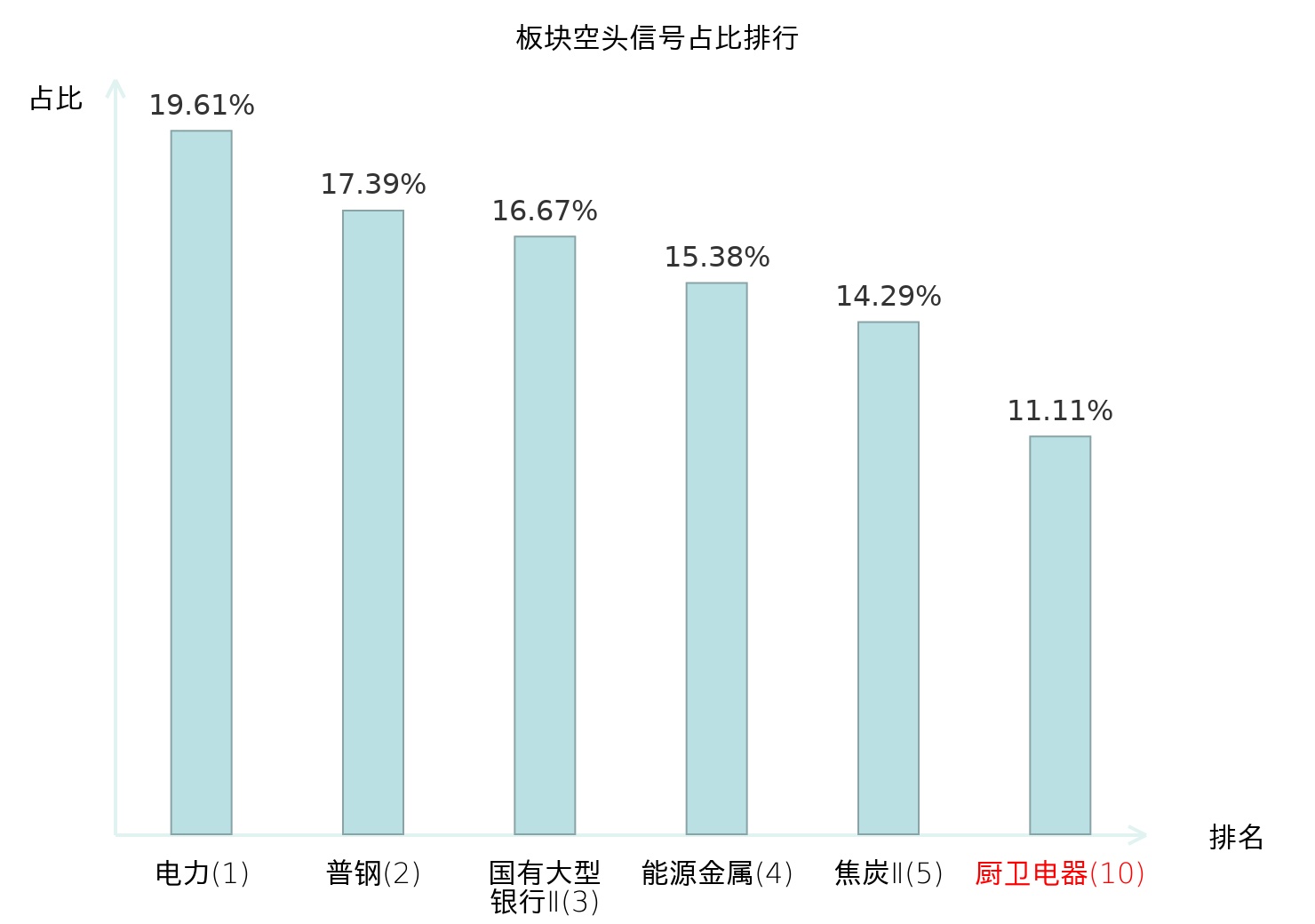 全市场所有行业板块中主力空头信号占比排名中,电力板块位居第一。服装家纺板块名次提升最快,较昨日上升107位。