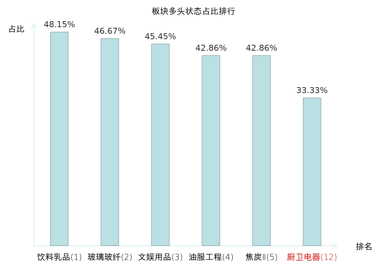 全市场所有行业板块中主力多头状态占比排名中,饮料乳品板块位居第一。商用车板块名次提升最快,较昨日上升77位。