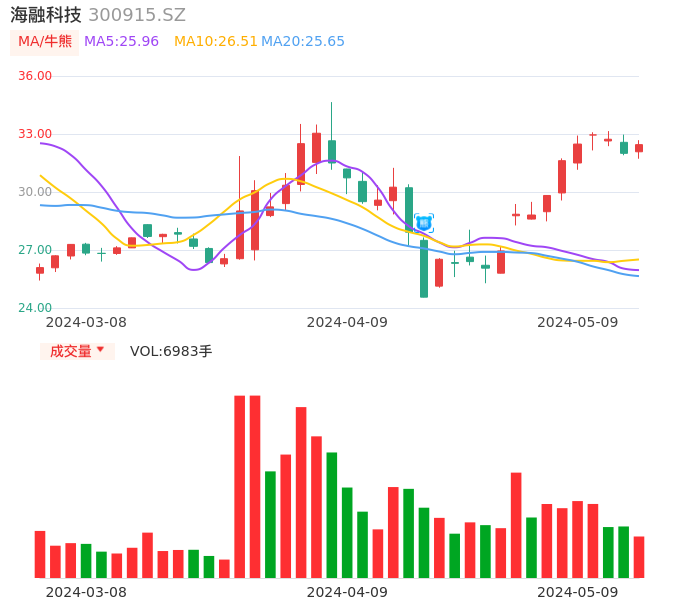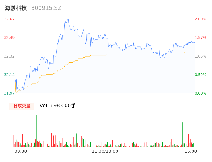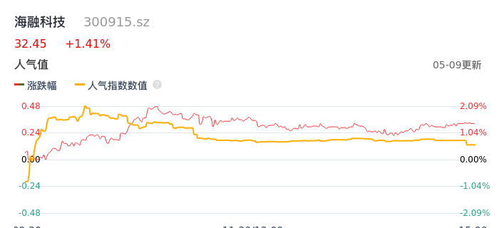 05月09日,海融科技收报32.45,股价涨幅1.41%,成交金额2259.80万元,换手率2.81%。