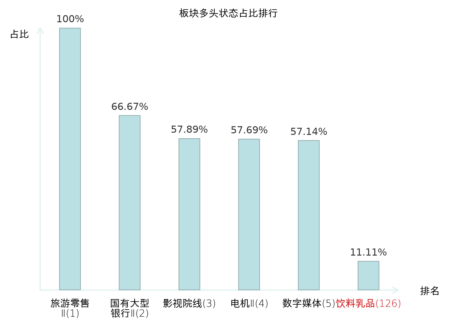 全市场所有行业板块中主力多头状态占比排名中,旅游零售Ⅱ板块位居第一。专业连锁Ⅱ板块名次提升最快,较昨日上升56位。