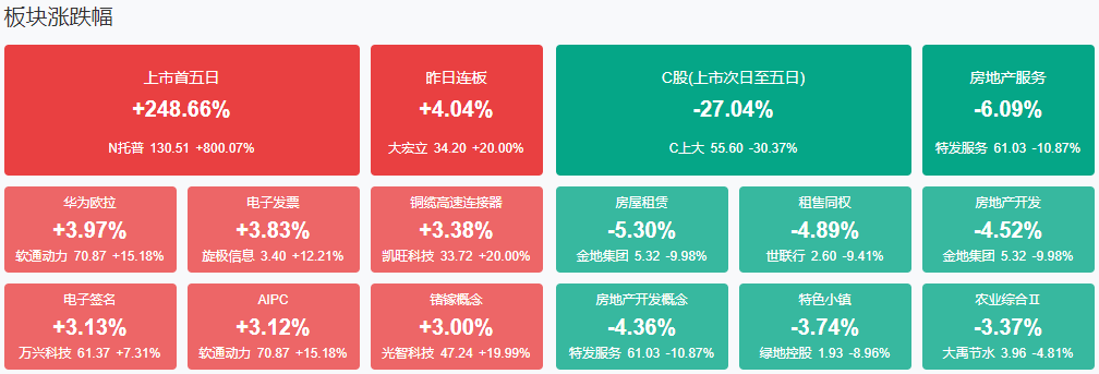 板块方面,铜高速连接、数据安全、消费电子、软件开发等板块涨幅居前,房地产、白酒、化肥、脑机接口等板块跌幅居前。