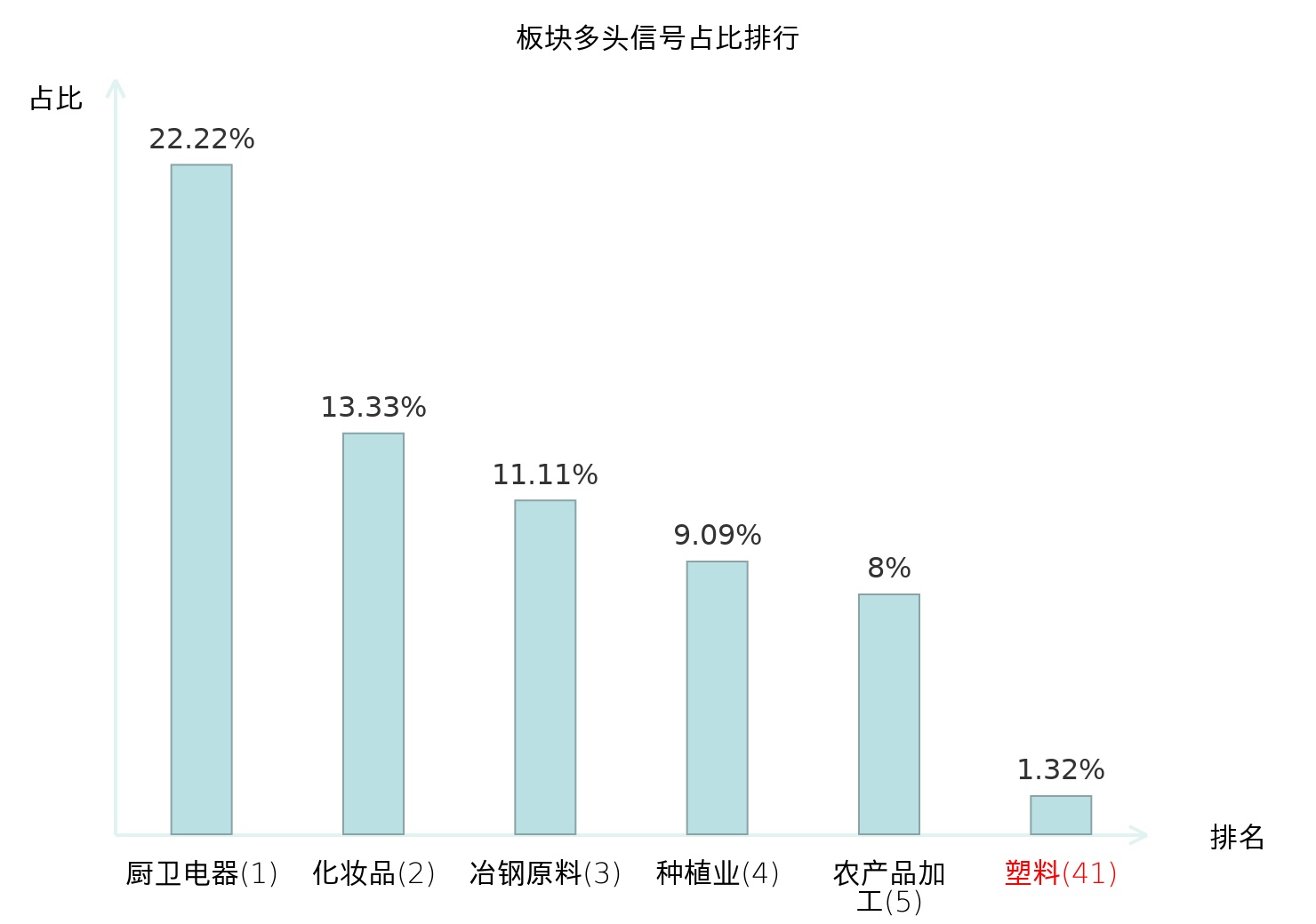 全市场所有行业板块中主力多头信号占比排名中,厨卫电器板块位居第一。化妆品板块名次提升最快,较昨日上升104位。