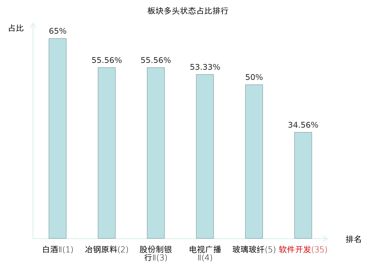 全市场所有行业板块中主力多头状态占比排名中,白酒Ⅱ板块位居第一。白酒Ⅱ板块名次提升最快,较昨日上升71位。