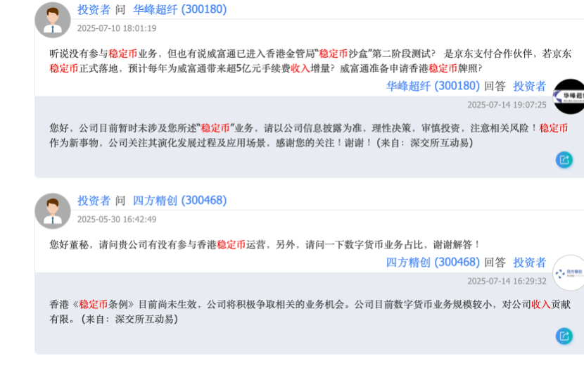 例如,华峰超纤(300180.SZ)7月10日回复投资者称,公司目前暂时未涉及投资者所述“稳定币”业务。四方精创近期也回应投资者称,公司目前数字货币业务规模较小,对公司收入贡献有限。电科网安(002268.SZ)近期也回复投资者称,公司目前暂无稳定币相关业务收入。