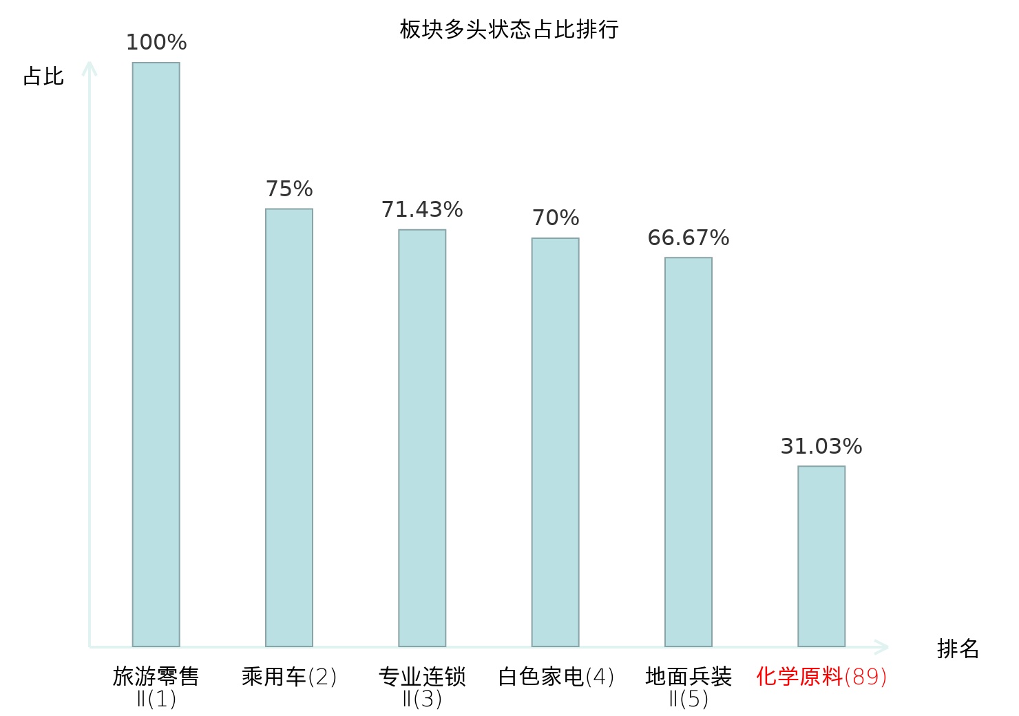 从主力宝信号数据分析,江天化学所属的化学原料板块中共18只股票处于主力多头状态,主力多头状态占比在全行业中排名第89位,较昨日一致。排名较高表明主力对于该板块整体看多意愿较强。全市场所有行业板块中主力多头状态占比排名中,旅游零售Ⅱ板块位居第一;焦炭Ⅱ板块名次提升最快,较昨日上升105位。这些变动揭示了不同行业间主力资金偏好的变化,为投资者提供了重要的市场参考。