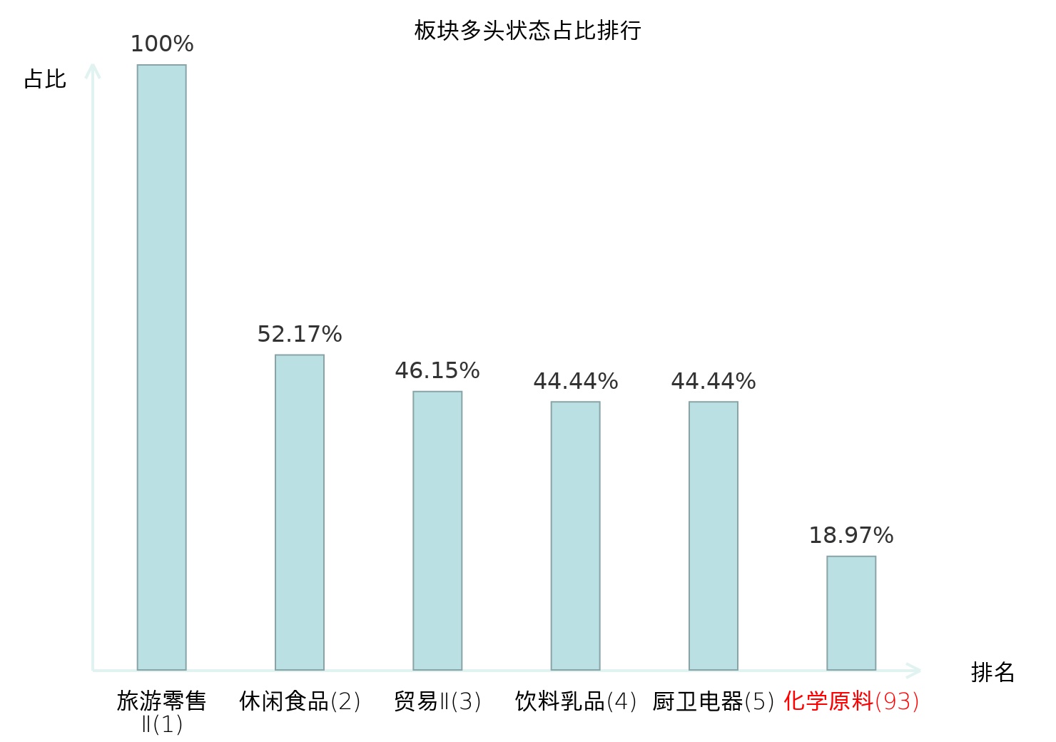 全市场所有行业板块中主力多头状态占比排名中,旅游零售Ⅱ板块位居第一。乘用车板块名次提升最快,较昨日上升91位。