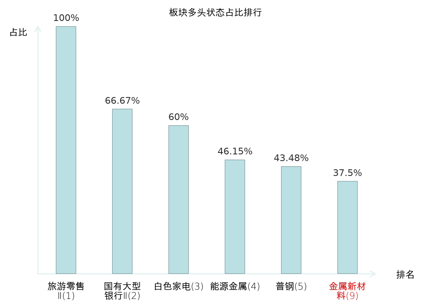 全市场所有行业板块中主力多头状态占比排名中,旅游零售Ⅱ板块位居第一。光学光电子板块名次提升最快,较昨日上升59位。