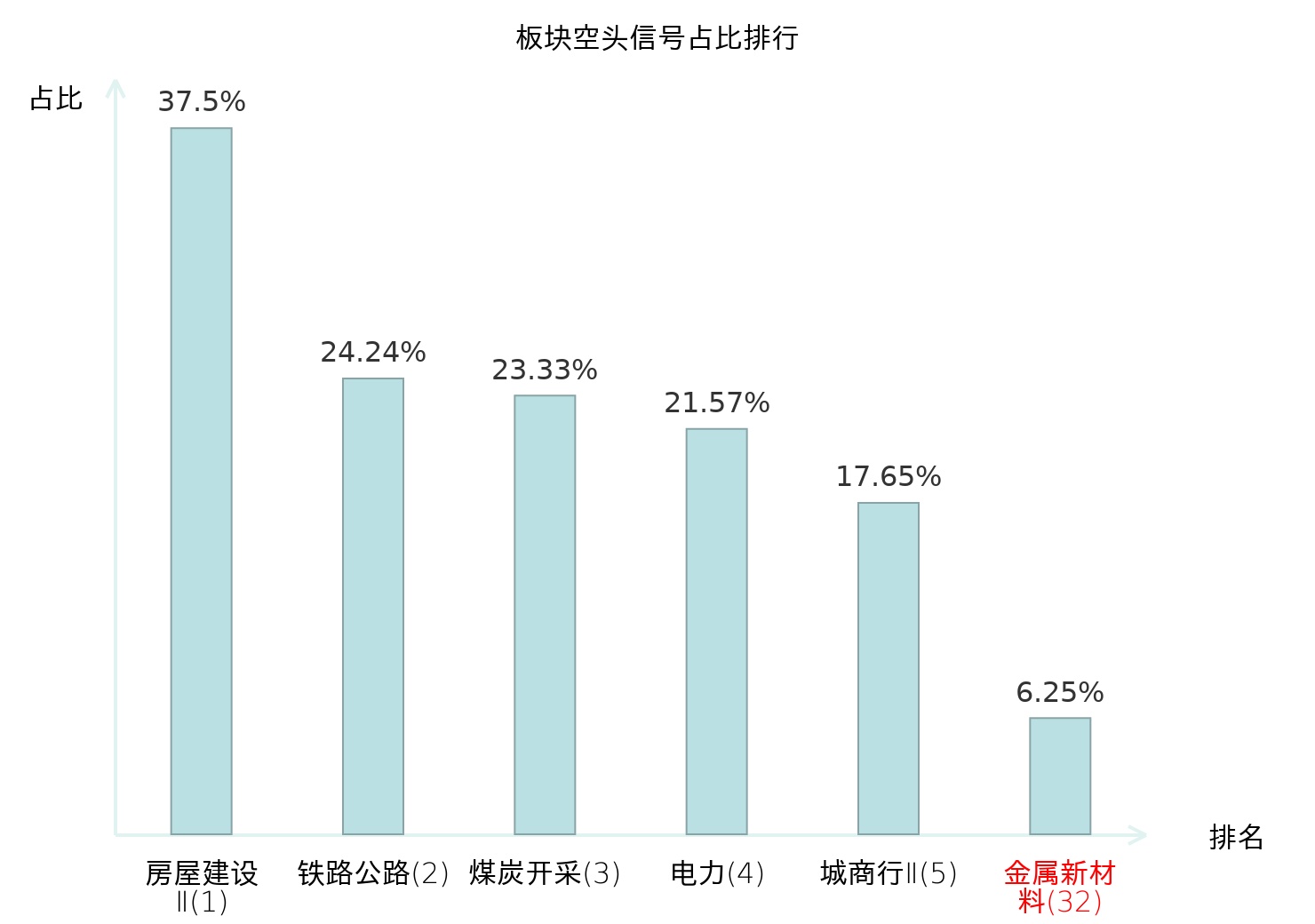 全市场所有行业板块中主力空头信号占比排名中,房屋建设Ⅱ板块位居第一。煤炭开采板块名次提升最快,较昨日上升117位。