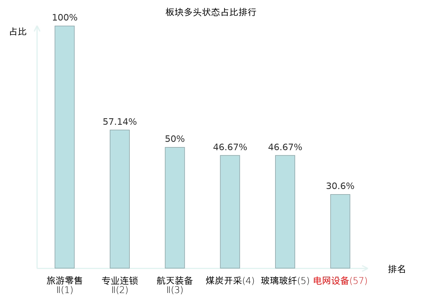 全市场所有行业板块中主力多头状态占比排名中,旅游零售Ⅱ板块位居第一。普钢板块名次提升最快,较昨日上升64位。