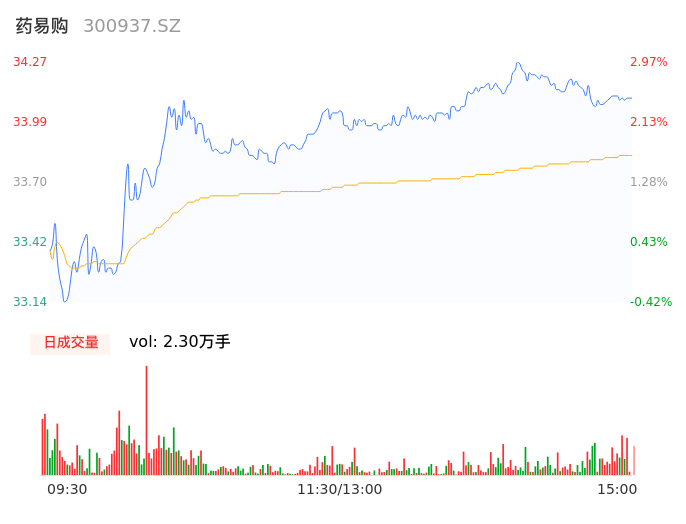 09月22日,药易购收报34.10,股价涨幅2.46%,成交金额7777.90万元,换手率5.58%。