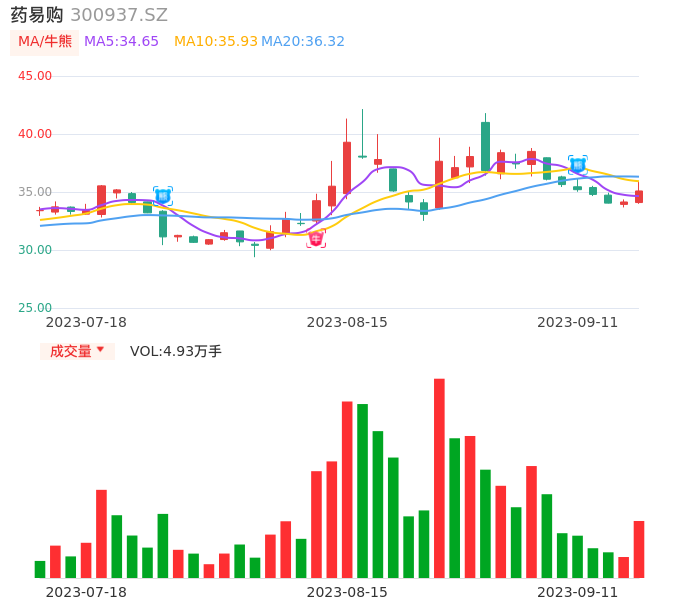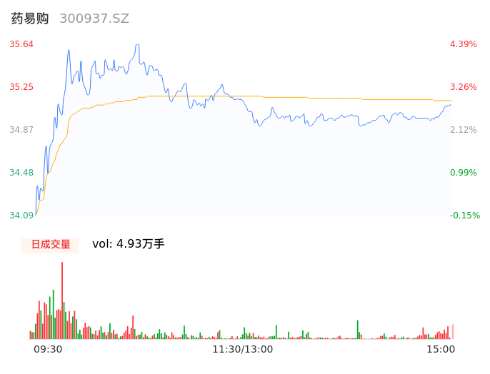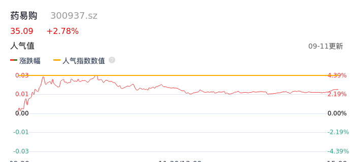 09月11日,药易购收报35.09,股价涨幅2.78%,成交金额1.73亿元,换手率11.97%。