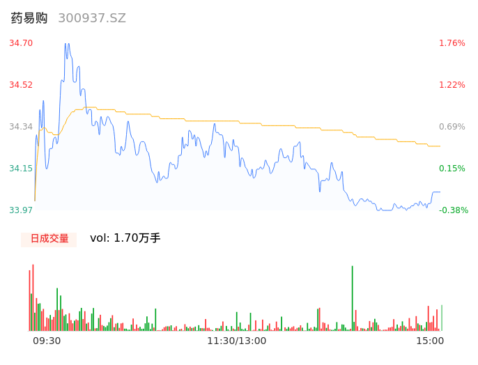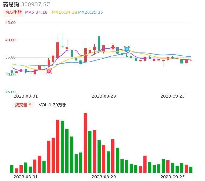 09月25日,药易购收报34.04,股价涨幅-0.18%,成交金额5811.61万元,换手率4.12%。