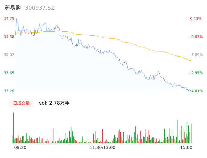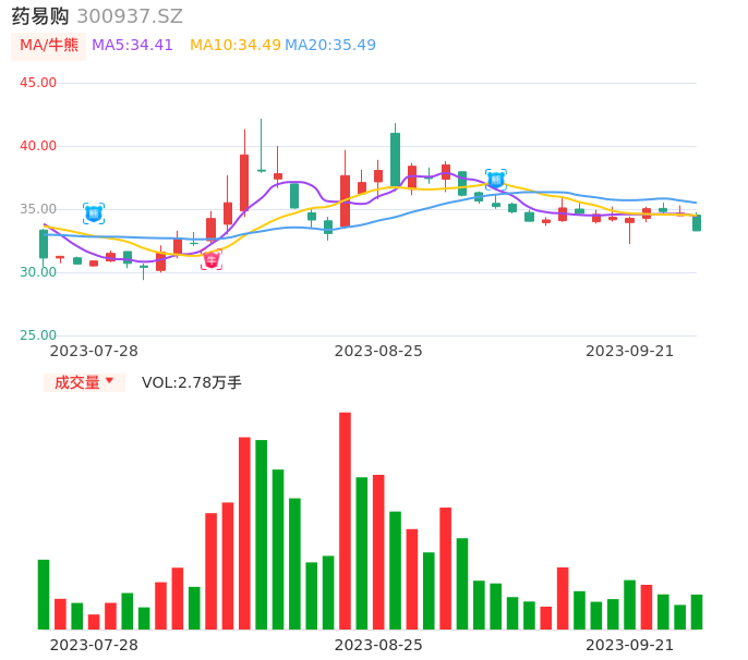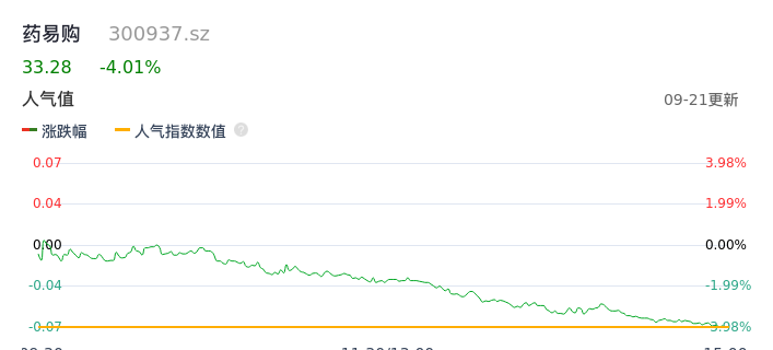 09月21日,药易购收报33.28,股价涨幅-4.01%,成交金额9410.57万元,换手率6.74%。
