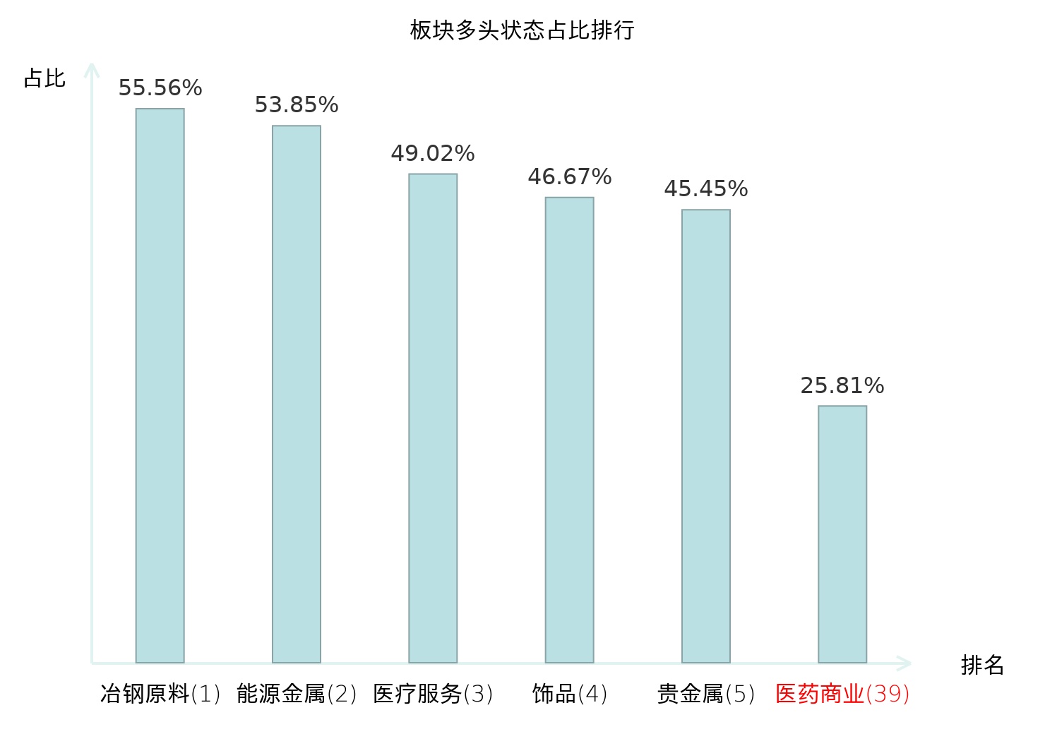 全市场所有行业板块中主力多头状态占比排名中,冶钢原料板块位居第一。能源金属板块名次提升最快,较昨日上升89位。