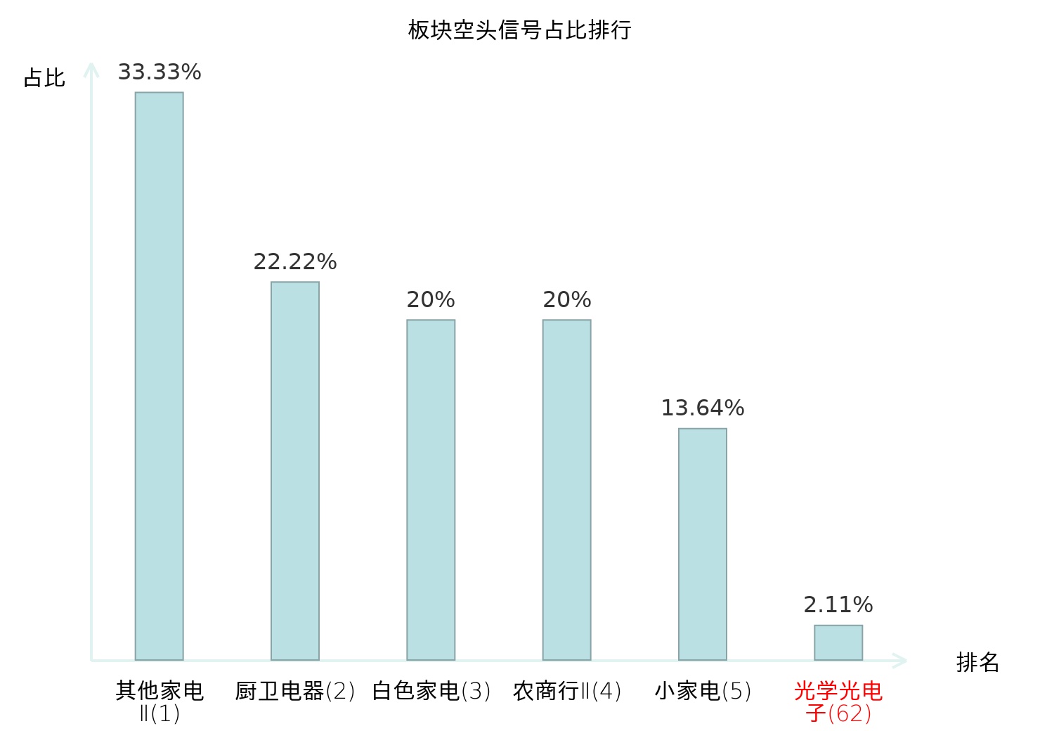 全市场所有行业板块中主力空头信号占比排名中,其他家电Ⅱ板块位居第一。地面兵装Ⅱ板块名次提升最快,较昨日上升107位。