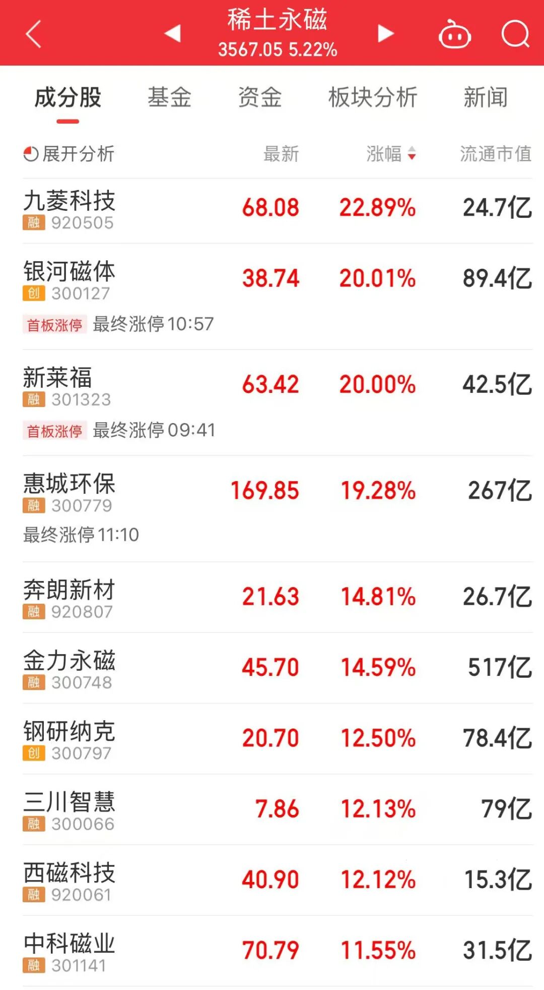 今天上午,稀土永磁板块大涨,九菱科技、银河磁体、新莱福等个股涨幅居前。