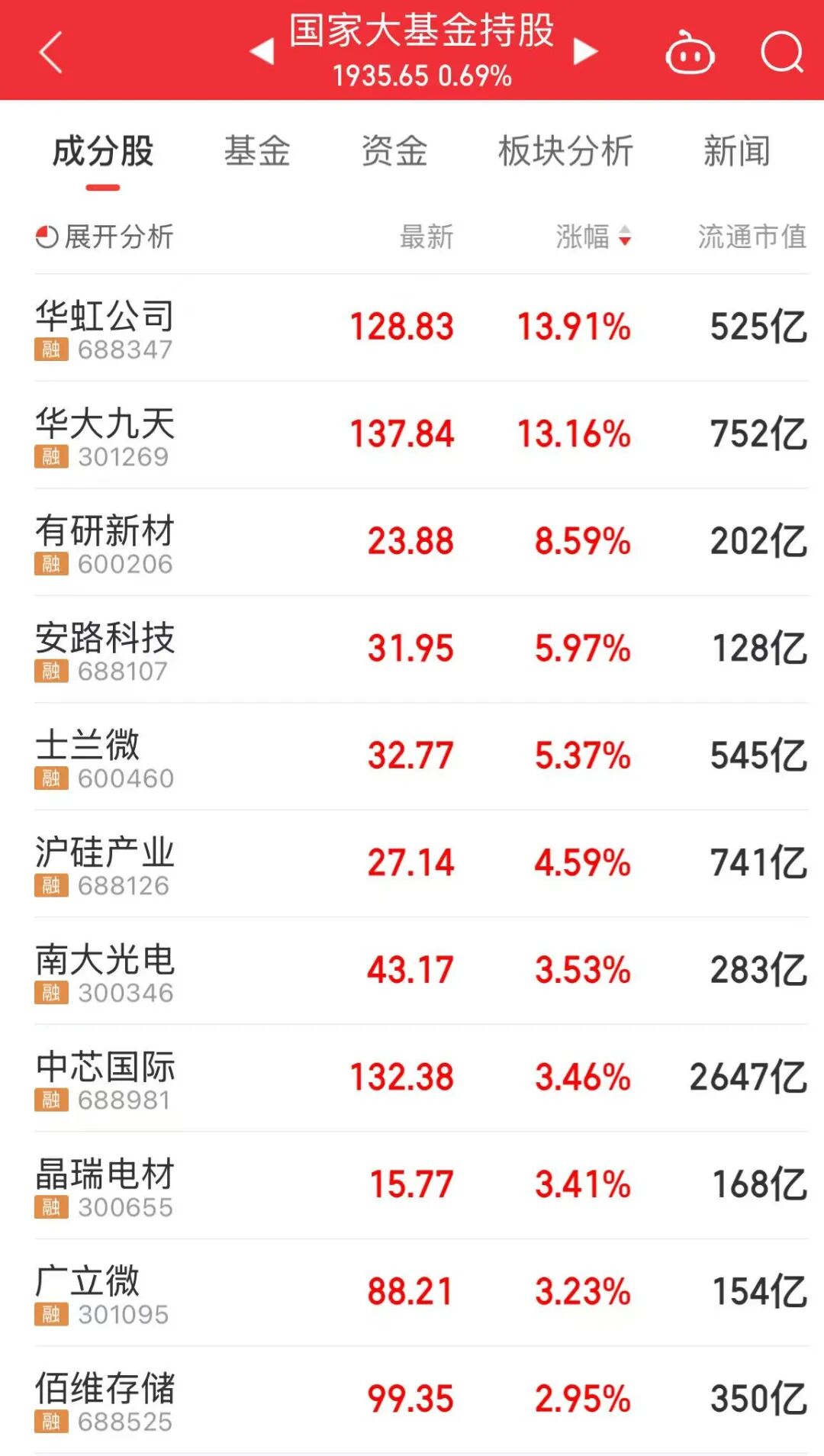 今天上午,半导体产业链表现活跃,国家大基金持股、光刻机等板块上涨,华虹公司、华大九天等个股大涨。