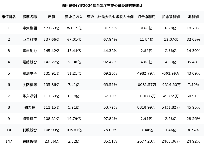 春晖智控最新报告期数据为半年度,下表汇总了通用设备行业内市值靠前的公司半年度主要经营数据