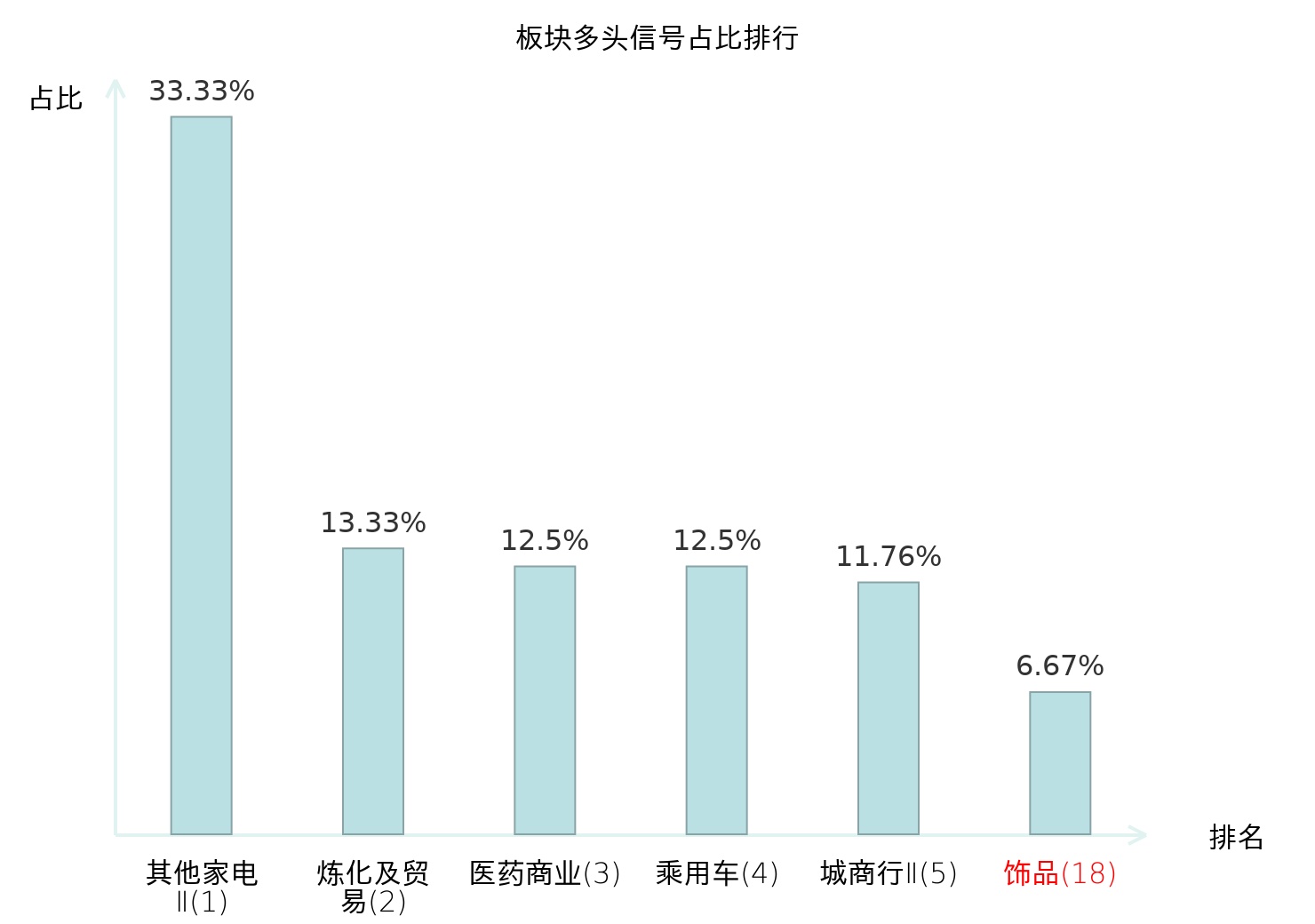 全市场所有行业板块中主力多头信号占比排名中,其他家电Ⅱ板块位居第一。其他家电Ⅱ板块名次提升最快,较昨日上升128位。
