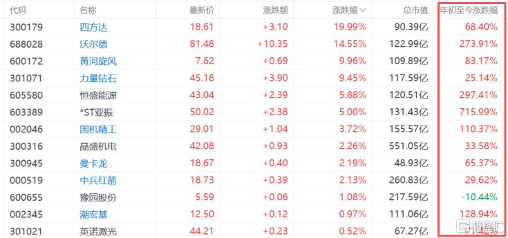 其中,*ST亚振涨幅高达710%,恒盛能源、沃尔德分别上涨超297%、273%,潮宏基、国机精工分别上涨超128%、110%。