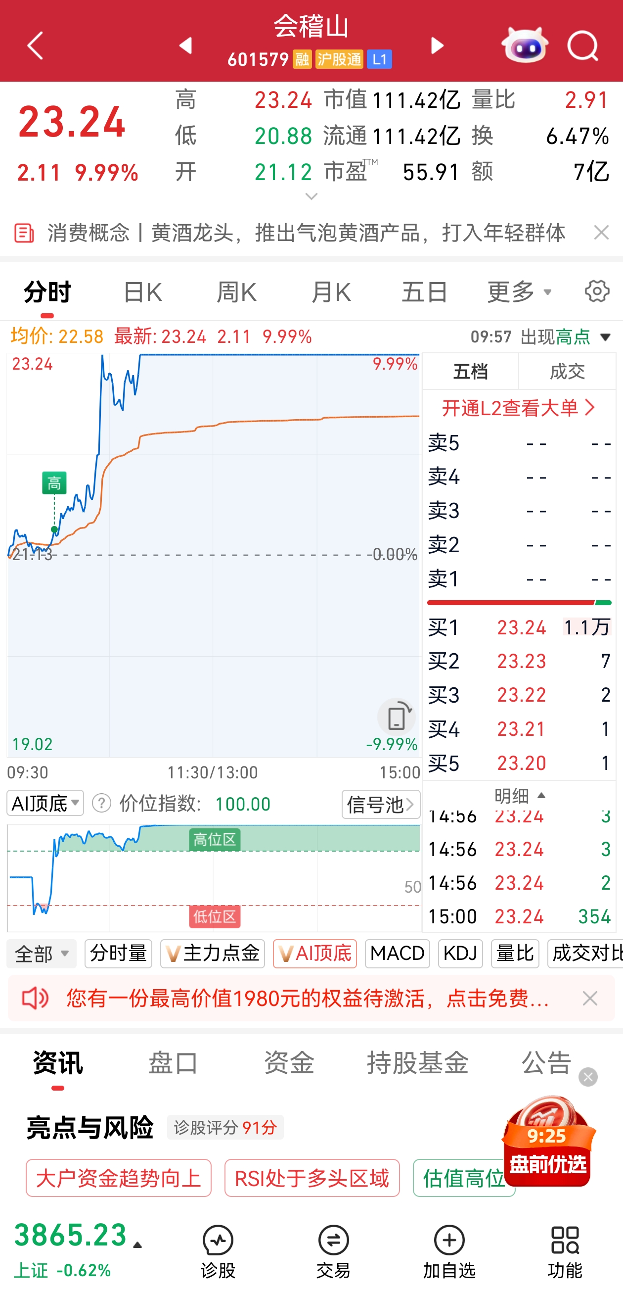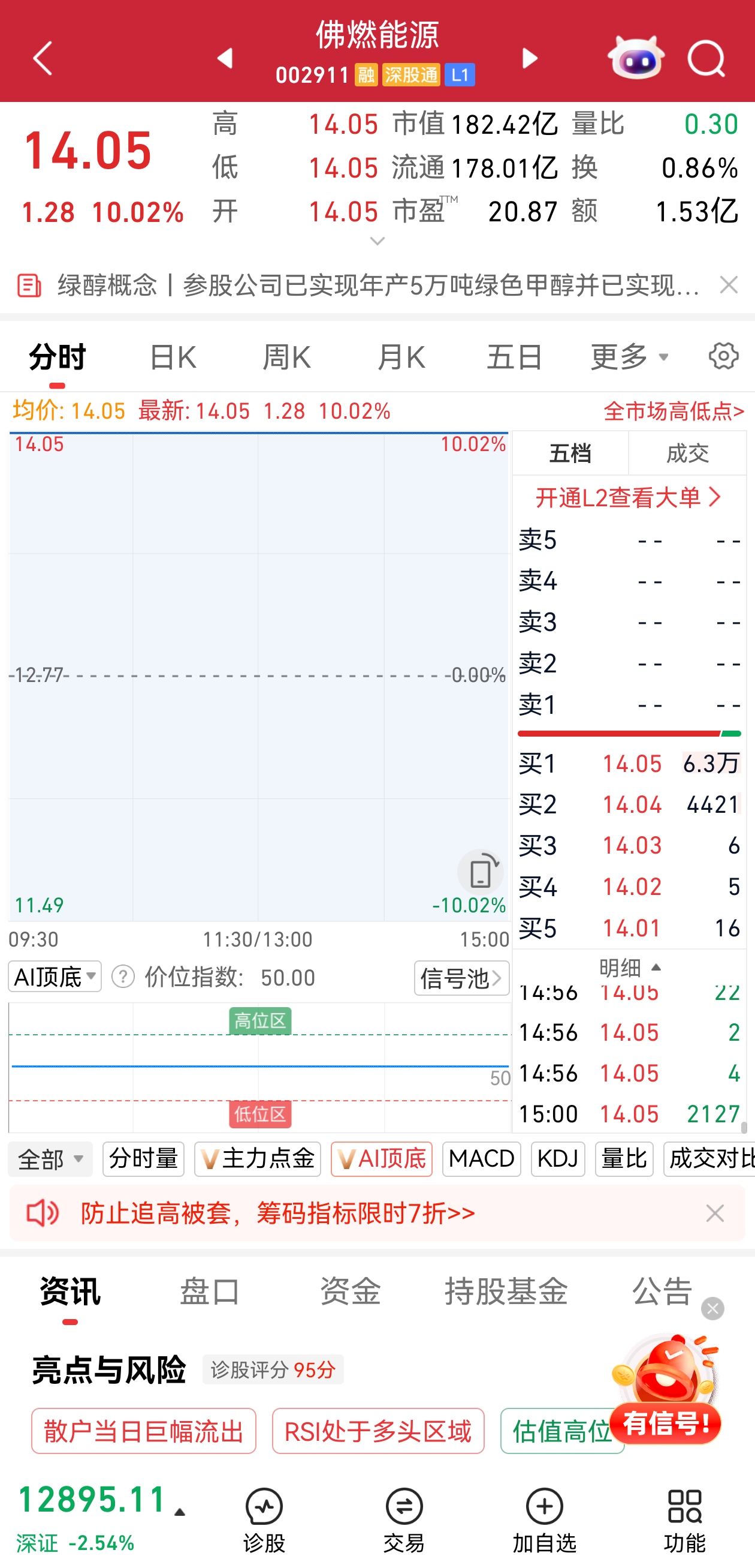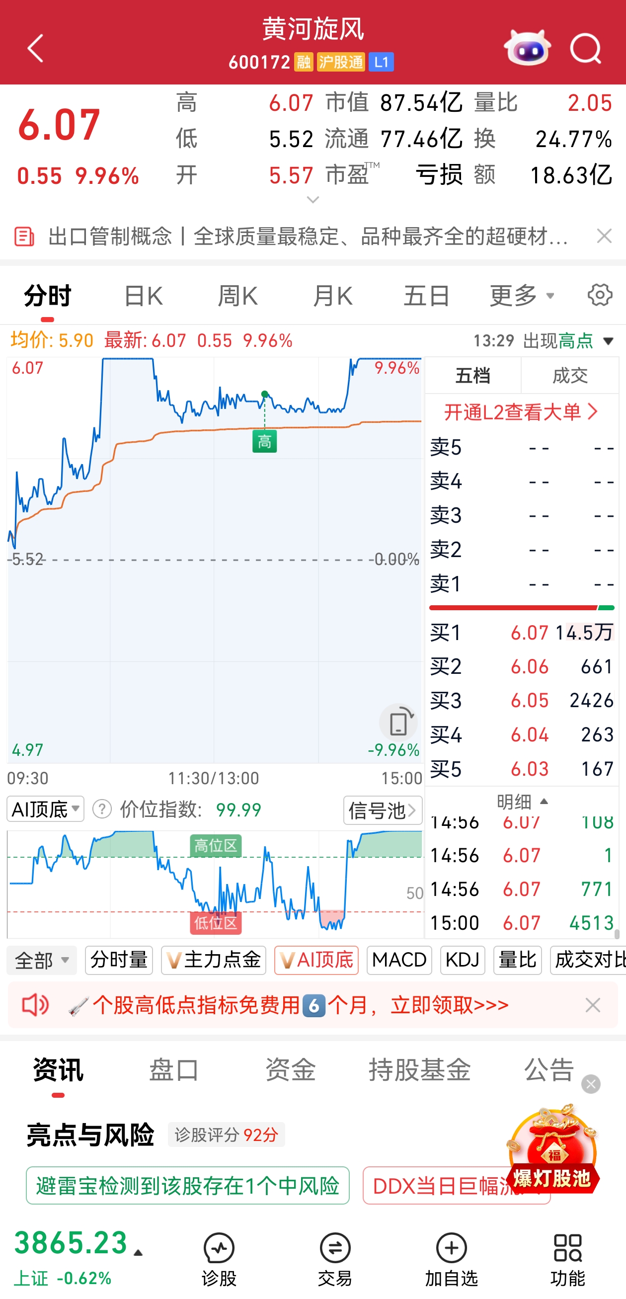 市场热点方面,培育钻石概念今日高开高走,板块指数一度放量涨近6%,创历史新高。黄河旋风临近收盘封死涨停,股价创年内新高;力量钻石尾盘一度触及20%涨停,惠丰钻石、四方达、曼卡龙等在尾盘均出现异动拉升的走势。