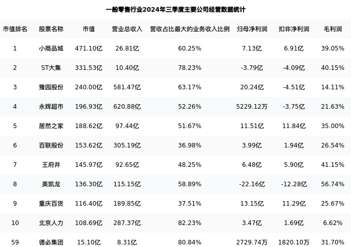 德必集团最新报告期数据为三季度,下表汇总了一般零售行业内市值靠前的公司三季度主要经营数据